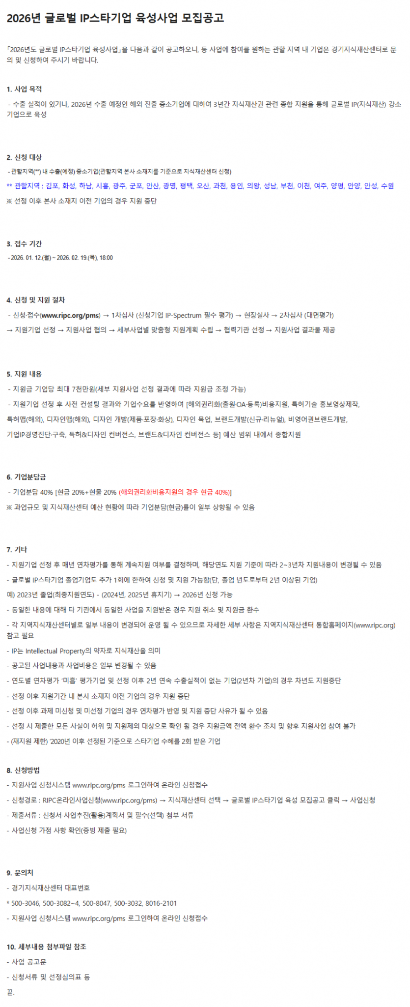 [경기] 2026년 글로벌 IP스타기업 육성 모집 공고