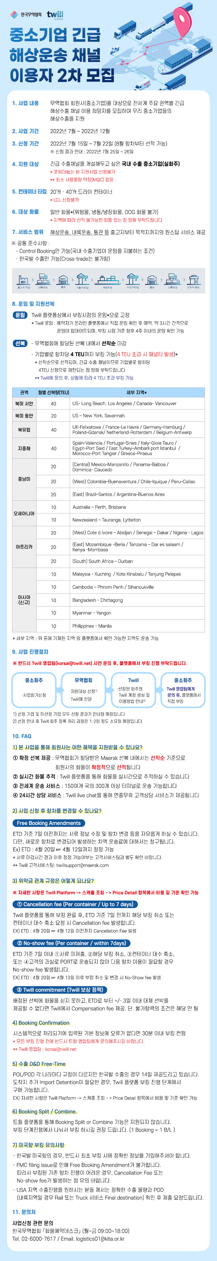 국내 수출 중소기업을 대상으로 전세계 주요 권역별 긴급 해상수출 채널 이용 희망자를 모집하여 우리 중소기업들의 해상수출을 지원해 드리는 사업입니다.