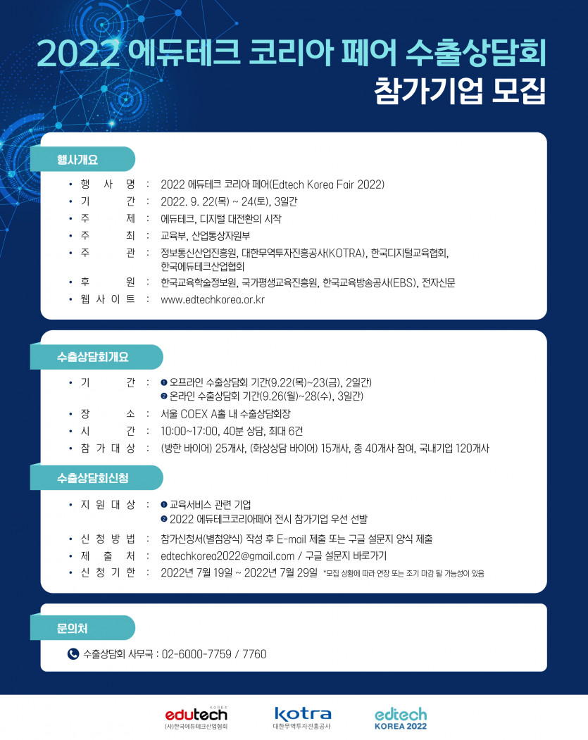 국내 에듀테크 기업의 해외시장 진출을 위해 '2022년 에듀테크 코리아 페어 수출상담회' 참가를 지원해 드리는 사업입니다.