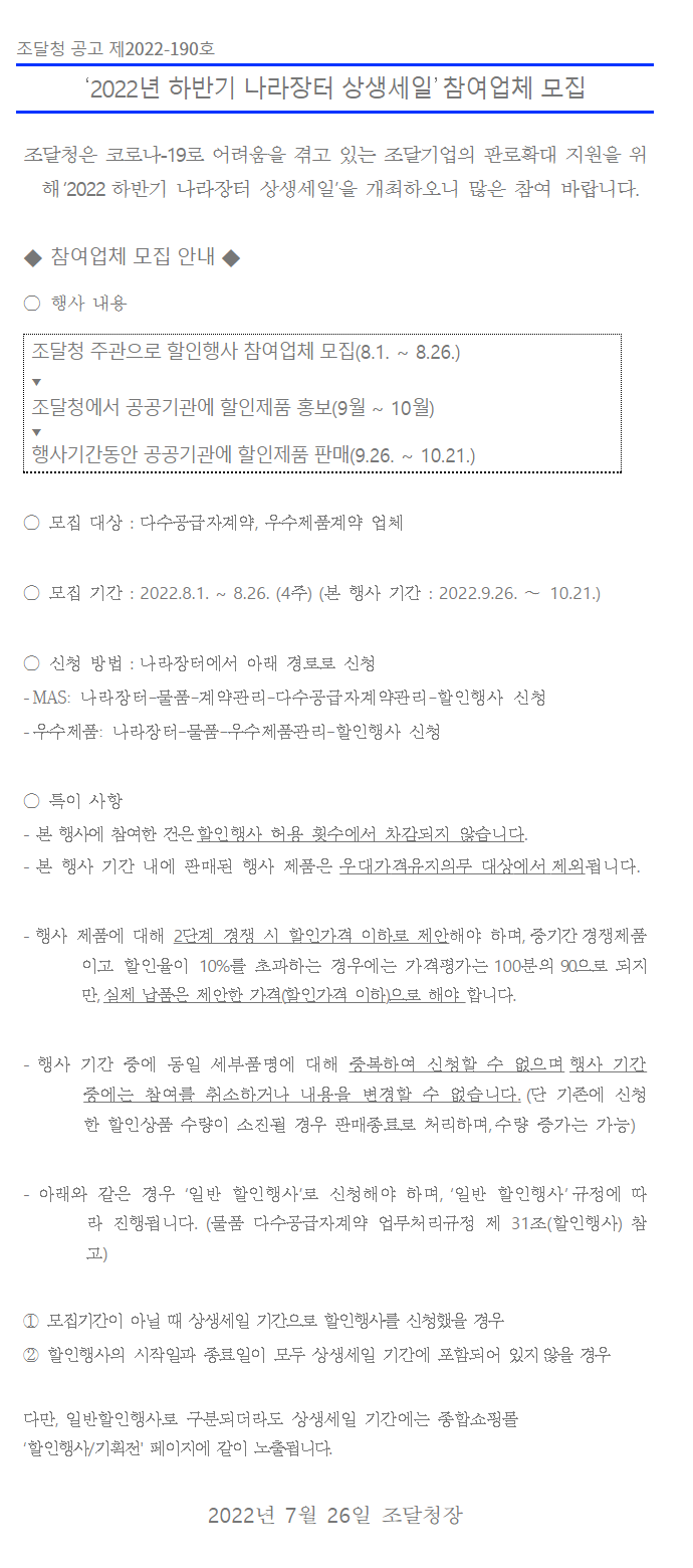 2022년 하반기 나라장터 상생세일 참여업체 모집 공고(코로나 19)