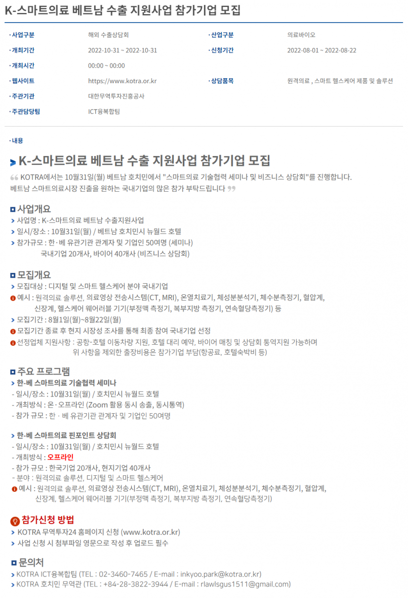 디지털 및 스마트 헬스케어 분야 국내기업의 베트남 스마트 의료시장 진출을 도모하기 위하여 '스마트의료 기술협력 세미나 및 비즈니스 상담회' 참가 시 공항-호텔 이동 차량, 바이어 매칭 및 상담회 통역 등을 지원해 드리는 사업입니다.