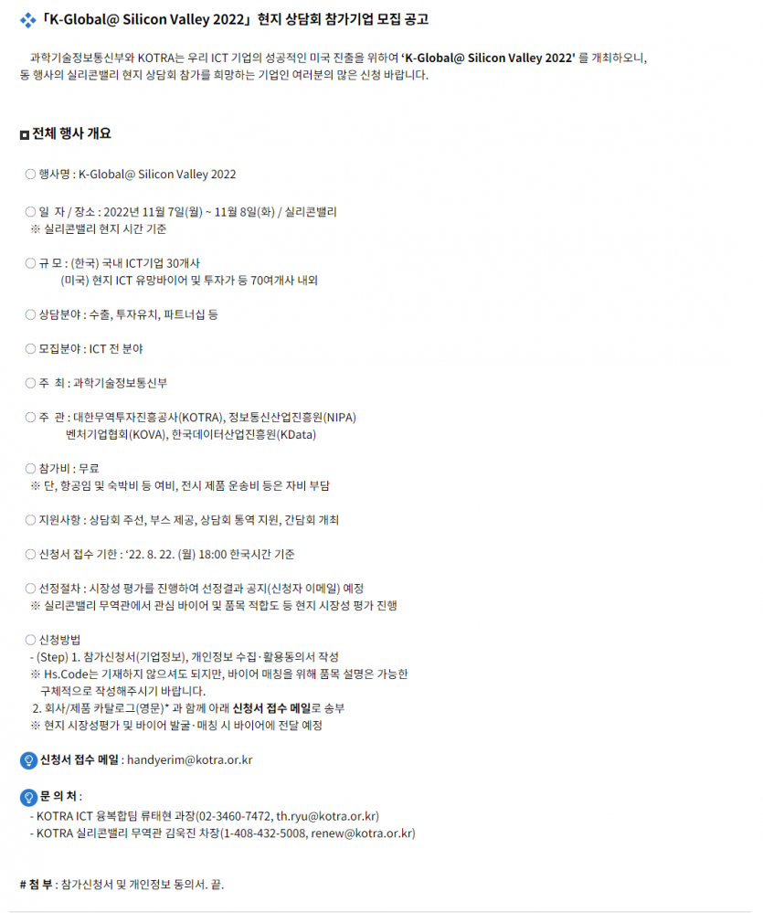 2022년 K-Global@ Silicon Valley 현지 상담회 참가기업 모집 공고