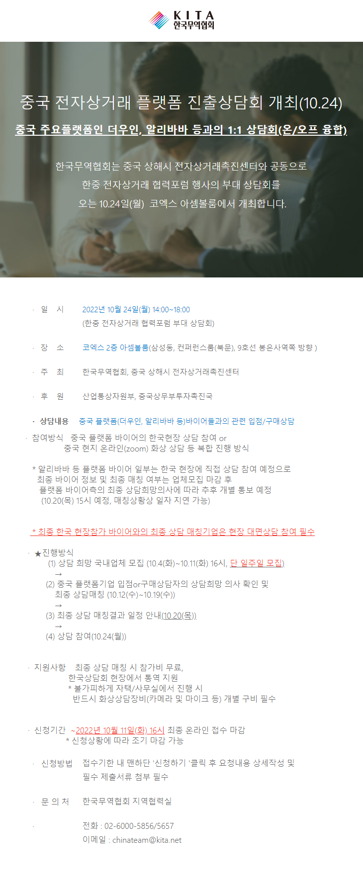 중국 플랫폼(더우인, 알리바바 등) 바이어들과의 관련 입점 및 구매상담을 원하는 국내 업체를 대상으로 상담회 참가 및 통역 등을 지원해 드리는 사업입니다.
