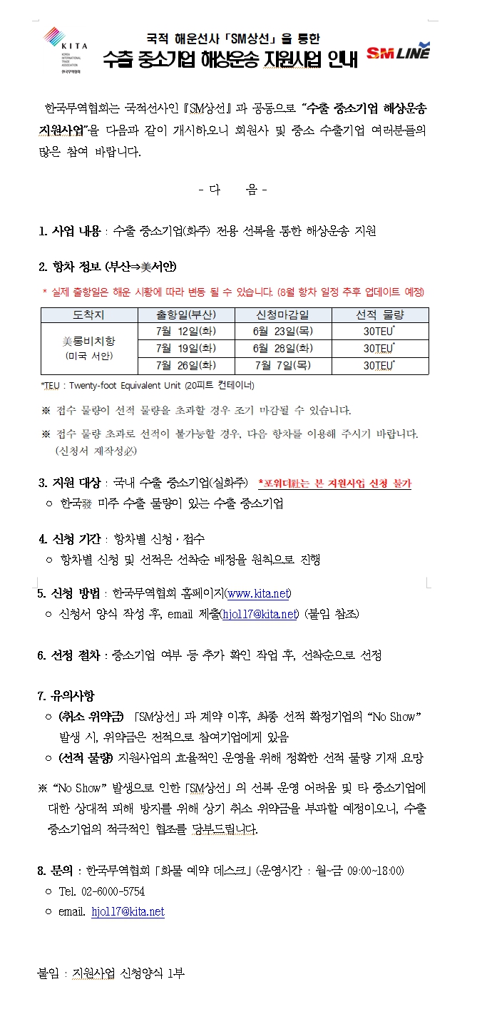 2022년 7월 국적 해운선사 SM상선을 통한 수출 중소기업 해상운송 지원사업 공고