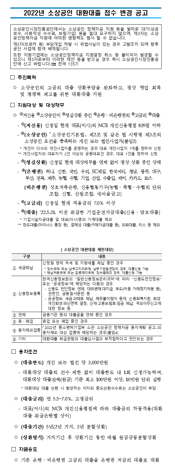 2022년 소상공인 대환대출 접수 변경 공고