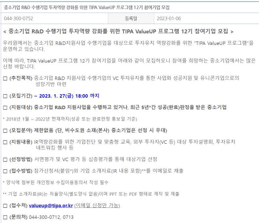 중소기업 R&D 수행기업 투자역량 강화를 위한 TIPA(중소기업기술정보진흥원) ValueUP 프로그램 12기 참여기업 모집 공…