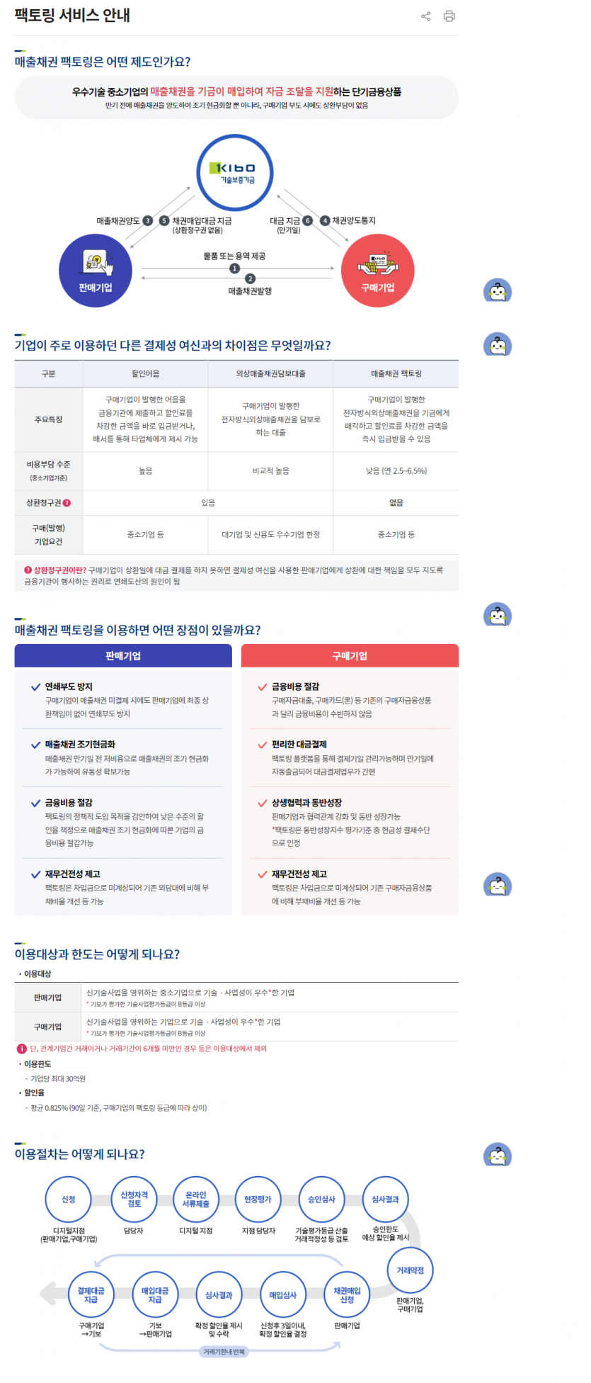 우수기술 중소기업의 매출채권을 기금이 매입하여 자금 조달을 지원하는 단기금융상품 만기 전에 매출채권을 양도하여 조기 현금화할 뿐 아니라, 구매기업 부도 시에도 상환부담이 없음