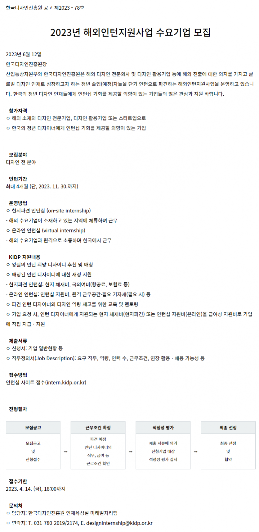 - 문의처한국디자인진흥원 인재육성실 미래일자리팀(T. 031-780-2019/2174, E. designinternship@kidp.or.kr)