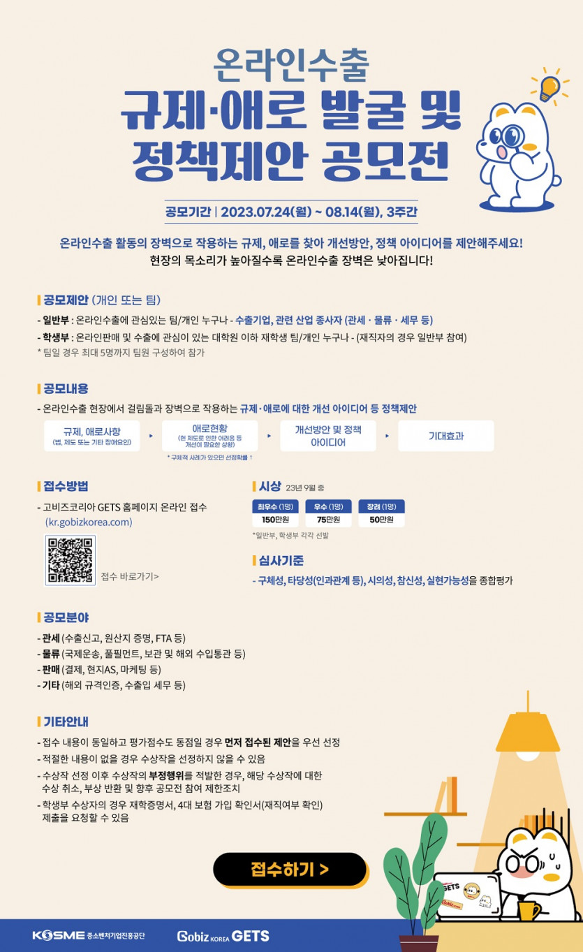 온라인수출 활동의 규제 완화 및 애로사항 해소를 도모하고자 '온라인수출 규제ㆍ애로 발굴 및 정책제안 공모전'을 개최하여 선정 시 시상을 해드리는 사업입니다.