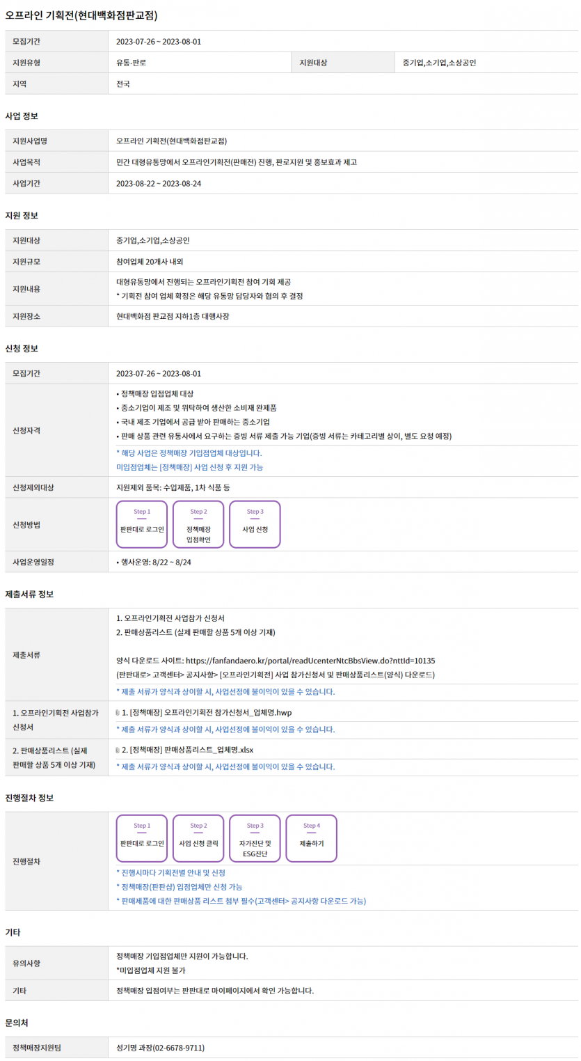 중기업, 소기업, 소상공인의 판로지원 및 홍보효과 제고 등을 위해 민간 대형유통망에서 진행되는 오프라인 기획전(판매전) 참여를 지원해 드리는 사업입니다.